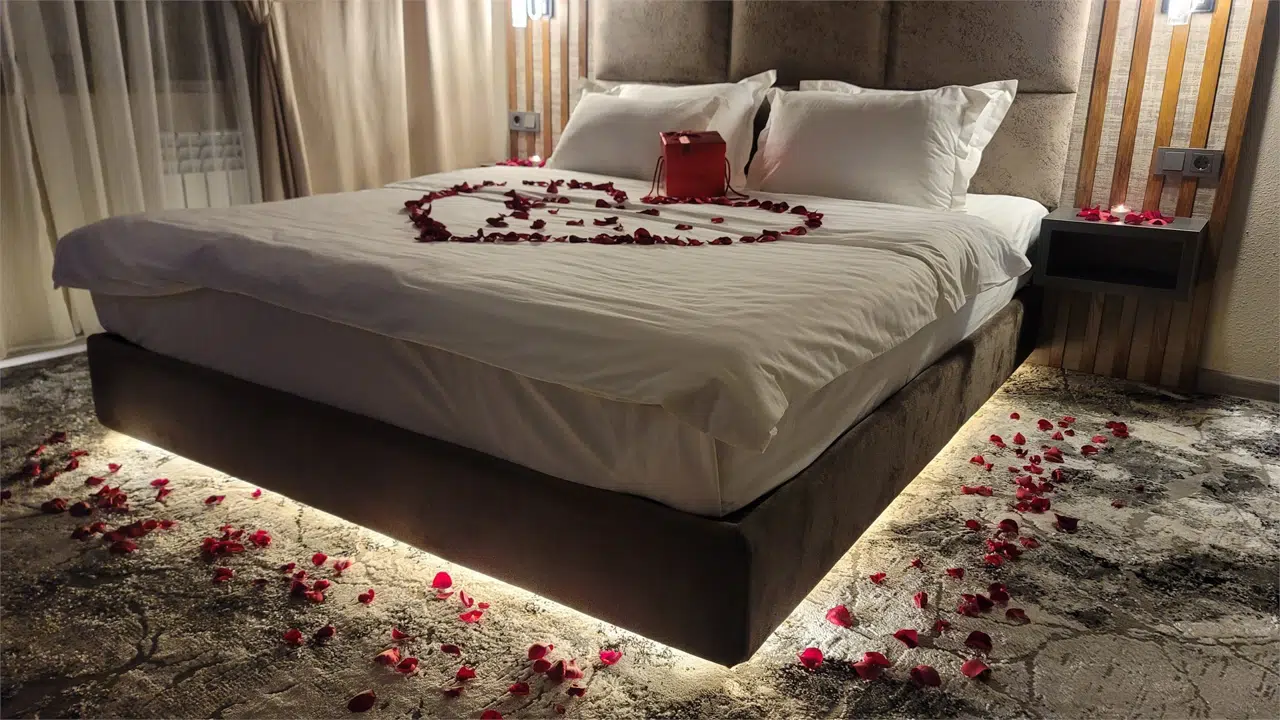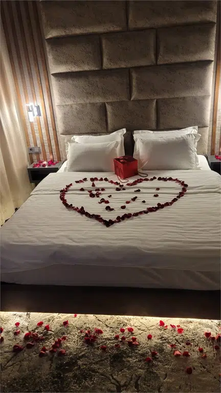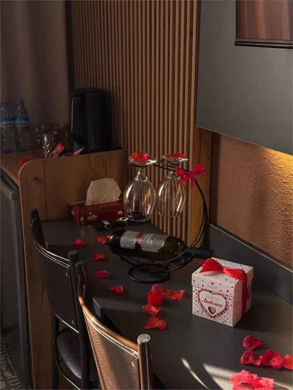 Лепестки роз на посели в виде сердце и по периметру номера свечи, Лепестки роз и свечи декоративные (безопасные и не пачкающие). Так же можем добавить вино и конфеты за доп оплату (100 000 сум).